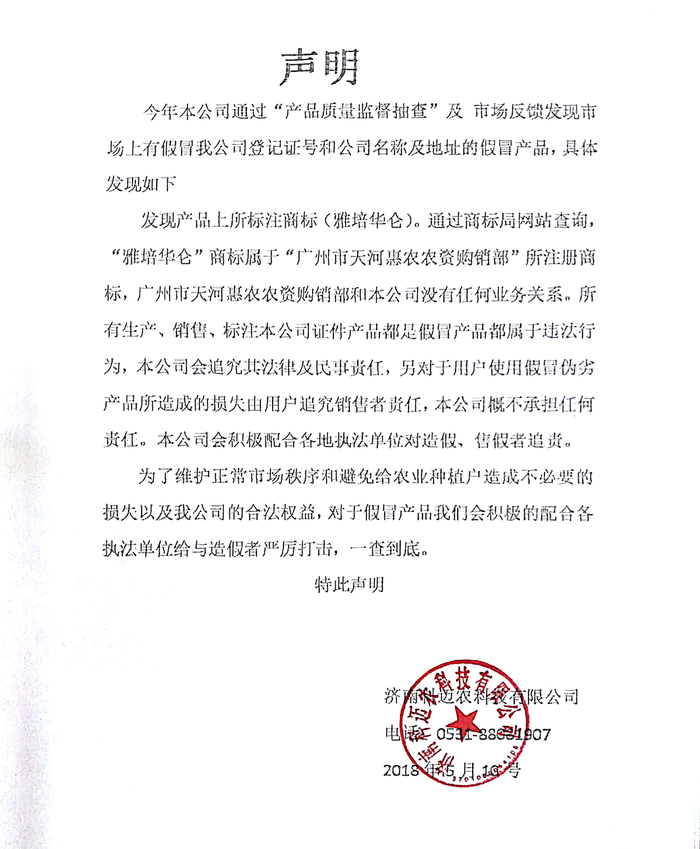 為了維護正常市場秩序和避免給農業(yè)種植戶造成不必要的損失以及我公司的合法權益,對于假冒產(chǎn)品我們會積極的配合各地執(zhí)法單位給予造假者嚴厲打擊,一查到底。